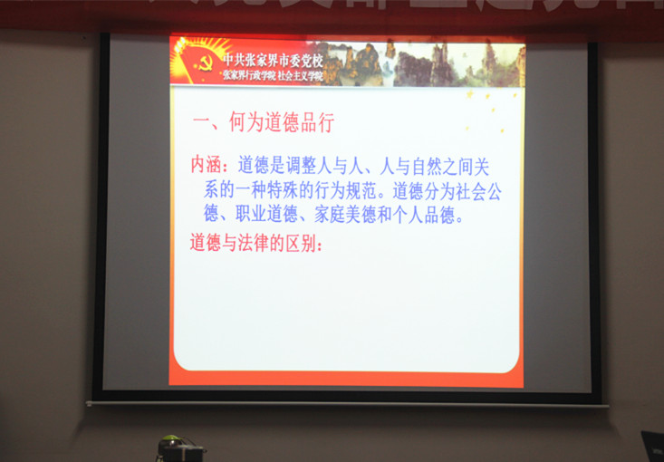 讲堂上,瞿孝军教授以“共产党员要带头讲道德有品行”为主题,从“何为道德品行”、“为何强调道德品行”、“怎样讲道德有品行”等三方面出发,结合《道德经》、《四书五经》等国学经典讲述了道德的内涵及重要意义,对社会公德、职业道德、家庭美德、个人品德作了深入浅出的讲解,尤其是在引用从古到今的道德典型事例时,让在场的每个人深深感悟到“德是做人之本”。